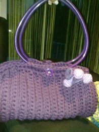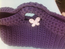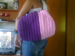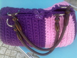 mala grande rosa e lilás com asas de madeira e fecho em borboleta