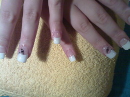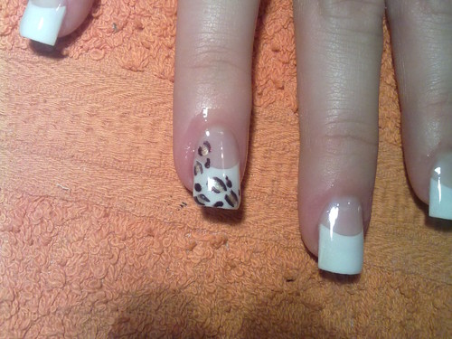 unhas de gel com ponta branca e desenho em castanho