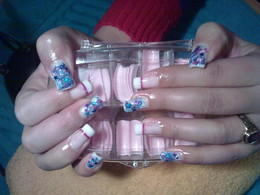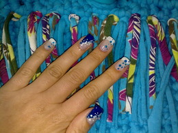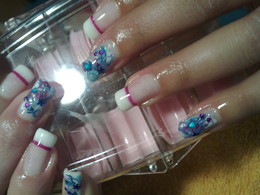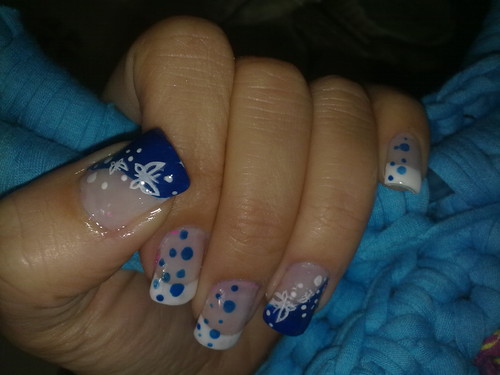 unhas de gel com ponta branca e desenho em azuis