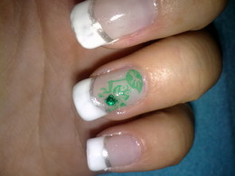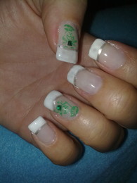 unhas de gel com ponta branca e sapinhos verdes