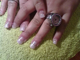 unhas de gel com ponta rosa claro e brilhantes rosa