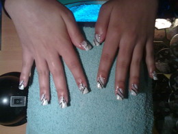 unhas de gel com ponta branca e desenho em prateado