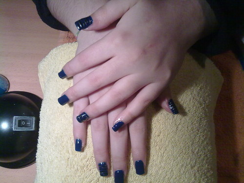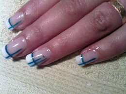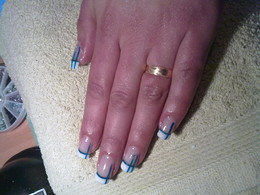 unhas de gel azul com riscas