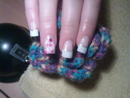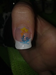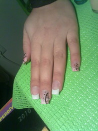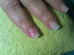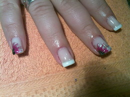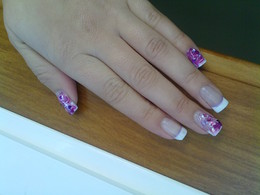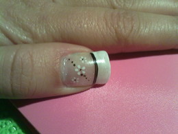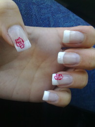 unhas de gel com ponta branca e desenho em rosa